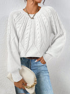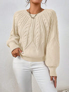 This beautifully knitted sweater features an elegant cable pattern on the front and soft, slightly balloon-shaped sleeves for a relaxed yet refined look. Made from a plush, skin-friendly fabric, it offers the perfect mix of comfort and sophistication for chilly days.